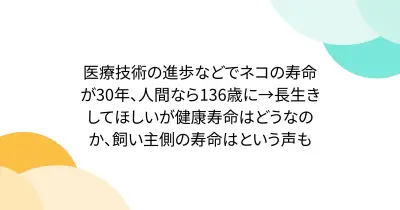 医療技術の進歩などでネコの寿命が30年、人間なら136歳に→長生きしてほしいが健康寿命はどうなのか、飼い主側の寿命はという声も