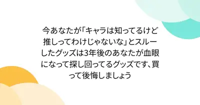 今あなたが「キャラは知ってるけど推しってわけじゃないな」とスルーしたグッズは3年後のあなたが血眼になって探し回ってるグッズです、買って後悔しましょう