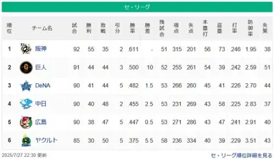 【セ順位】神==========巨=-横==-中-広=====-ヤク【7/27】