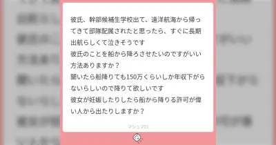海上自衛隊の彼氏が長期出航に行ってしまうので、船から降ろすためにどうしたらいいかアドバイスをください→回答が厳しくも的確過ぎた「そらそう」「残念だけど向いてないよ」