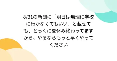 8/31の新聞に「明日は無理に学校に行かなくてもいい」と載せても、とっくに夏休み終わってますから、やるならもっと早くやってください