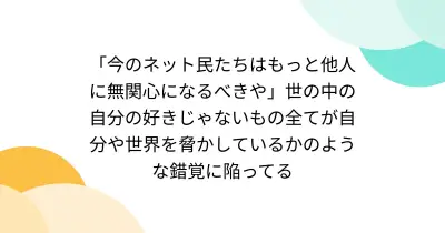 「今のネット民たちはもっと他人に無関心になるべきや」世の中の自分の好きじゃないもの全てが自分や世界を脅かしているかのような錯覚に陥ってる