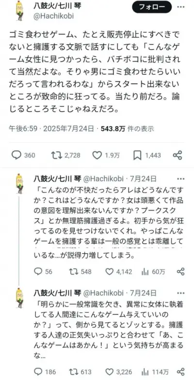 【悲報】BL作家「女性の身体に執着してる人にこんなゲーム与えるな販売停止しろ」 X民「こんな作品書いてる人が言うことか?」