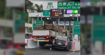 沖縄県地元情報局「高速道路の料金所でトラックと乗用車が同時に入り挟まった状態になっています、通行の際はご注意下さい」