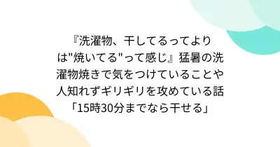 『洗濯物、干してるってよりは"焼いてる"って感じ』猛暑の洗濯物焼きで気をつけていることや人知れずギリギリを攻めている話「15時30分までなら干せる」