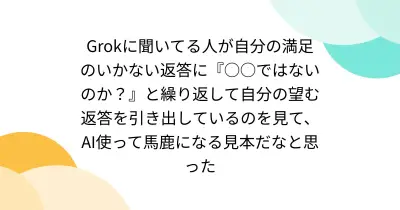 Grokに聞いてる人が自分の満足のいかない返答に『○○ではないのか?』と繰り返して自分の望む返答を引き出しているのを見て、AI使って馬鹿になる見本だなと思った
