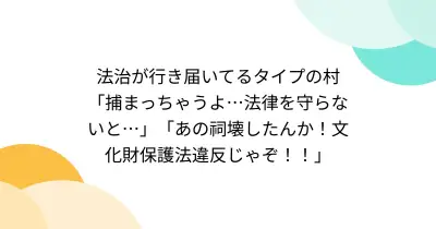 法治が行き届いてるタイプの村「捕まっちゃうよ…法律を守らないと…」「あの祠壊したんか!文化財保護法違反じゃぞ!!」