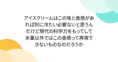 アイスクリームはこの味と食感があれば別に冷たい必要ないと思うんだけど現代の科学力をもってして氷菓以外ではこの食感って再現できないものなのだろうか