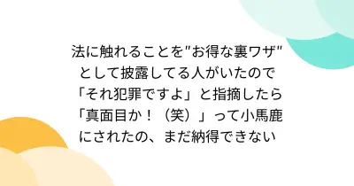 法に触れることを″お得な裏ワザ″として披露してる人がいたので「それ犯罪ですよ」と指摘したら「真面目か!(笑)」って小馬鹿にされたの、まだ納得できない