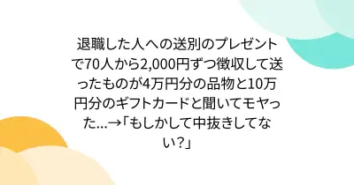 退職した人への送別のプレゼントで70人から2,000円ずつ徴収して送ったものが4万円分の品物と10万円分のギフトカードと聞いてモヤった...→「もしかして中抜きしてない?」