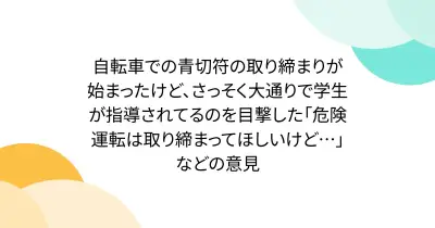 自転車での青切符の取り締まりが始まったけど、さっそく大通りで学生が指導されてるのを目撃した「危険運転は取り締まってほしいけど…」などの意見