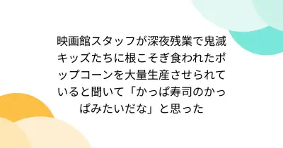映画館スタッフが深夜残業で鬼滅キッズたちに根こそぎ食われたポップコーンを大量生産させられていると聞いて「かっぱ寿司のかっぱみたいだな」と思った