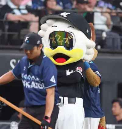 マスコットのマーくんが新庄監督のものまね披露 サングラスに「スクイズ」の文字