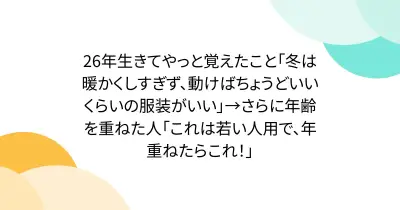26年生きてやっと覚えたこと「冬は暖かくしすぎず、動けばちょうどいいくらいの服装がいい」→さらに年齢を重ねた人「これは若い人用で、年重ねたらこれ!」