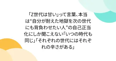 「Z世代は甘い」って言葉、本当は“自分が耐えた地獄を次の世代にも背負わせたい人”の自己正当化にしか聞こえない「いつの時代も同じ」「それぞれの世代にはそれぞれの辛さがある」