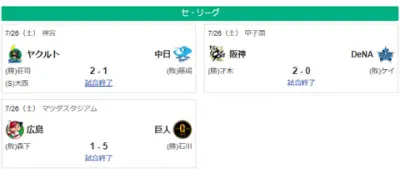 7/26セリーグ順位 神=========-//-巨-横==-中-広======-ヤ