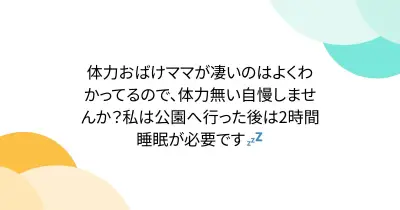 体力おばけママが凄いのはよくわかってるので、体力無い自慢しませんか?私は公園へ行った後は2時間睡眠が必要です💤