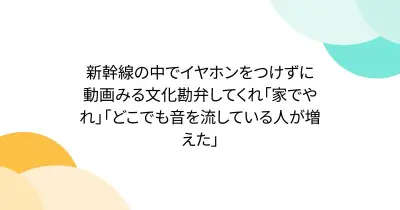 新幹線の中でイヤホンをつけずに動画みる文化勘弁してくれ「家でやれ」「どこでも音を流している人が増えた」