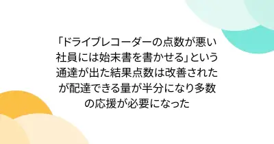 「ドライブレコーダーの点数が悪い社員には始末書を書かせる」という通達が出た結果点数は改善されたが配達できる量が半分になり多数の応援が必要になった