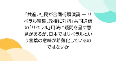 「共産、社民が合同街頭演説 - リベラル結集、政権に対抗」共同通信の「リベラル」用法に疑問を呈す意見があるが、日本ではリベラルという言葉の意味が希薄化しているのではないか
