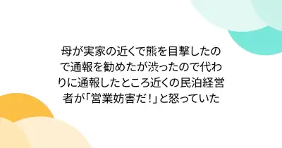 母が実家の近くで熊を目撃したので通報を勧めたが渋ったので代わりに通報したところ近くの民泊経営者が「営業妨害だ!」と怒っていた