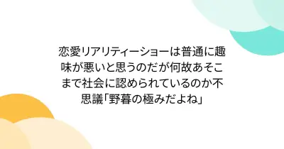 恋愛リアリティーショーは普通に趣味が悪いと思うのだが何故あそこまで社会に認められているのか不思議「野暮の極みだよね」