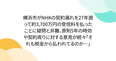 横浜市がNHKの契約漏れを27年遡って約3,700万円の受信料を払ったことに疑問と非難、原則5年の時効や契約周りに対する意見が続々「それも税金から払われてるのか…」