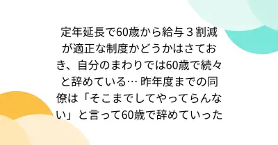 定年延長で60歳から給与3割減が適正な制度かどうかはさておき、自分のまわりでは60歳で続々と辞めている… 昨年度までの同僚は「そこまでしてやってらんない」と言って60歳で辞めていった