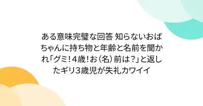 ある意味完璧な回答 知らないおばちゃんに持ち物と年齢と名前を聞かれ「グミ!4歳!お(名)前は?」と返したギリ3歳児が失礼カワイイ