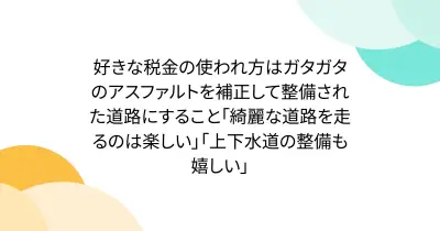 好きな税金の使われ方はガタガタのアスファルトを補正して整備された道路にすること「綺麗な道路を走るのは楽しい」「上下水道の整備も嬉しい」