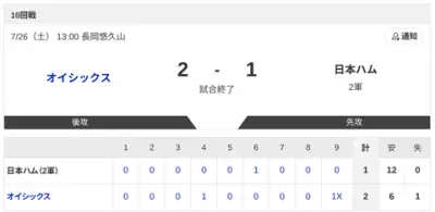 【2軍オイシックスvs.日本ハム】2-1で負け