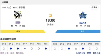 【虎実況】[7月26日] 阪神 vs DeNA 15回戦(甲子園)18:00~