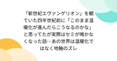 「新世紀エヴァンゲリオン」を観ていた四半世紀前に「このまま温暖化が進んだらこうなるのかな」と思ってたが実際はセミが鳴かなくなった話…あの世界は温暖化ではなく地軸のズレ