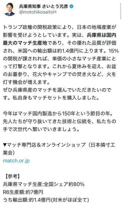 【朗報】斎藤兵庫県知事が宣伝したマッチ、一瞬で売り切れに