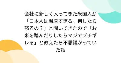 会社に新しく入ってきた米国人が「日本人は温厚すぎる。何したら怒るの?」と聞いてきたので「お米を踏んだりしたらマジでブチギレる」と教えたら不思議がっていた話
