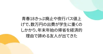 青春18きっぷ廃止や夜行バス値上げで、数万円の出費が学生に重くのしかかり、年末年始の帰省を経済的理由で諦める友人が出てきた