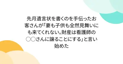 先月遺言状を書くのを手伝ったお客さんが「妻も子供も全然見舞いにも来てくれない。財産は看護師の◯◯さんに譲ることにする」と言い始めた