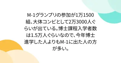 M-1グランプリの参加が1万1500組、大体コンビとして2万3000人ぐらいが出ている。博士課程入学者数は1.5万人ぐらいなので、今年博士進学した人よりもM-1に出た人の方が多い。