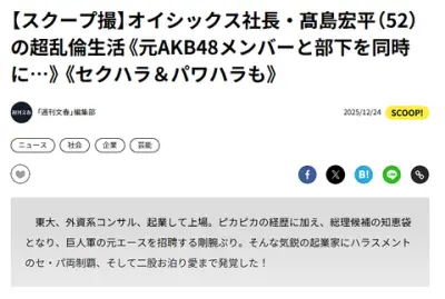 オイシックス・ラ・大地の筆頭株主兼社長の髙島宏平さん 、セパ不倫(セクハラ+パワハラ+不倫)文春砲を被弾した件でお詫び