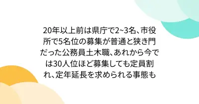 20年以上前は県庁で2~3名、市役所で5名位の募集が普通と狭き門だった公務員土木職、あれから今では30人位ほど募集しても定員割れ、定年延長を求められる事態も