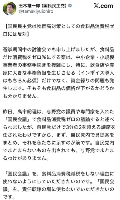 国民民主・玉木「高市は2/3持ってるんだから消費税減税できないの野党のせいにするなよ」