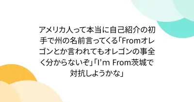 アメリカ人って本当に自己紹介の初手で州の名前言ってくる「Fromオレゴンとか言われてもオレゴンの事全く分からないぞ」「I’m From茨城で対抗しようかな」