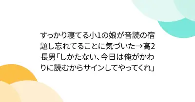 すっかり寝てる小1の娘が音読の宿題し忘れてることに気づいた→高2長男「しかたない、今日は俺がかわりに読むからサインしてやってくれ」