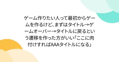 ゲーム作りたい人って最初からゲームを作るけど、まずはタイトル→ゲームオーバー→タイトルに戻るという遷移を作った方がいい「ここに肉付けすればAAAタイトルになる」
