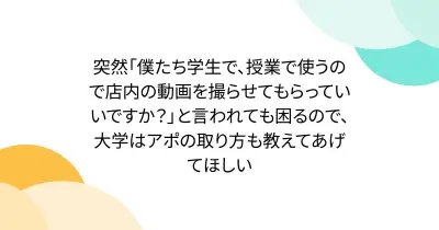 突然「僕たち学生で、授業で使うので店内の動画を撮らせてもらっていいですか?」と言われても困るので、大学はアポの取り方も教えてあげてほしい