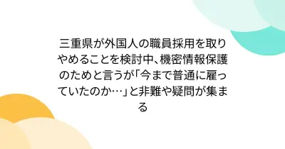 三重県が外国人の職員採用を取りやめることを検討中、機密情報保護のためと言うが「今まで普通に雇っていたのか…」と非難や疑問が集まる