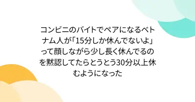コンビニのバイトでペアになるベトナム人が「15分しか休んでないよ」って顔しながら少し長く休んでるのを黙認してたらとうとう30分以上休むようになった