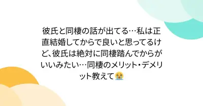 彼氏と同棲の話が出てる…私は正直結婚してからで良いと思ってるけど、彼氏は絶対に同棲踏んでからがいいみたい…同棲のメリット・デメリット教えて😭