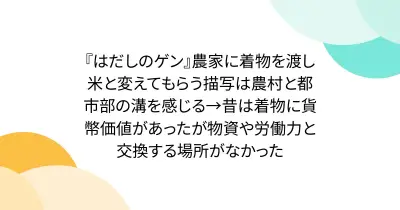 『はだしのゲン』農家に着物を渡し米と変えてもらう描写は農村と都市部の溝を感じる→昔は着物に貨幣価値があったが物資や労働力と交換する場所がなかった