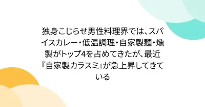 独身こじらせ男性料理界では、スパイスカレー・低温調理・自家製麺・燻製がトップ4を占めてきたが、最近『自家製カラスミ』が急上昇してきている